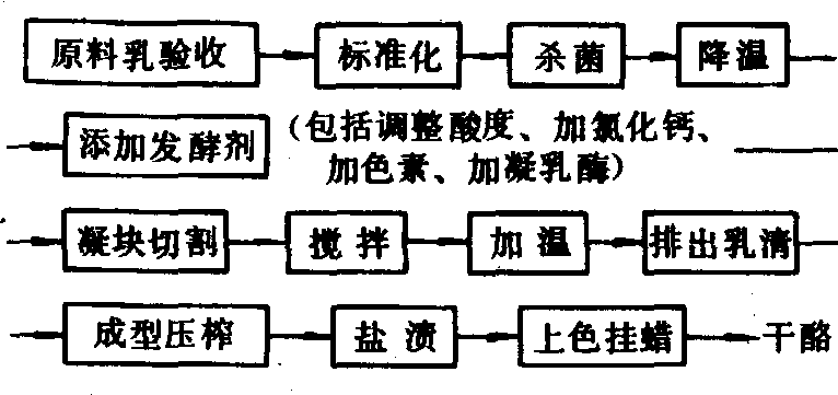 原料乳必须由健康乳牛所产的优质乳中获得。除一般所要求的理化及卫生指标符合标准外,这种牛乳不得含有抗菌素。生产干酪的原料乳最重要的特性是加入凝乳酶时的凝结能力和凝块释放出乳清的能力。 标准化 见乳粉加工。 杀菌 消灭有害菌和致病菌,卫生上保证安全,以防异常发酵,质量均匀一致,延长干酪保存期;由于加热杀菌使乳清蛋白凝固,能使其留在干酪中增加干酪产量。一般杀菌均采用63℃、30分钟的低温长时间杀菌,或71~75℃、15秒的高温短时间杀菌。杀菌温度的高低直接影响成品质量,温度过高,凝乳时凝块松软,收缩作用减弱,水分含量偏高。 添加发酵剂 原料乳经杀菌以后,无论是有害的还是有益的微生物(如乳酸菌),全部被消灭。但乳中如缺乏乳酸菌时,不可能获得正常成熟的干酪,必须添加发酵剂,以促使干酪正常发酵。用于生产干酪的乳酸菌发酵剂,随干酪种类而异。最主要的菌种有乳酸链球菌、乳脂链球菌、干酪乳杆菌等。乳经杀菌后,直接泵入干酪槽中,冷却至30~32℃时,加入搅拌均匀的发酵剂,充分搅拌10分钟后,取样测定乳酸度。干酪生产过程中,温度、时间可以控制,但酸度系乳酸菌发酵产生,较难控制。为使产品质量一致,可用1摩尔/升的盐酸调整酸度。调整程度随原料乳情况而定。牛乳的色泽因季节和所喂饲料而异,为了使干酪均呈微黄色,需在原料乳中添加适量色素。通常用胭脂橙的碳酸钠浸出液或粉末,一般每1000千克原料乳加30~60克浸出液。先将色素用6倍水(灭菌水)稀释,随即加入杀菌后的原料乳中,充分搅拌,混合均匀。生产干酪所用的凝乳酶,以皱胃酶为主,也可用胃蛋白酶代替。根据酶的活力(或称效价)决定酶的添加量,即指1毫升皱胃酶溶液(或1克干粉)在一定温度下(35℃)、一定时间内(通常为40分钟)能凝固原料乳的毫升数。先用1%的食盐水(或灭菌水)将酶配成2%的溶液,并在28~32℃下保温30分钟。然后加到原料乳中,均匀搅拌1~2分钟后加盖,使原料乳静置凝固。 凝块切割 乳凝固后,凝块达到适当硬度时,用干酪刀切成7~10毫米的立方体。 搅拌及二次加温 凝块切割后,开始慢慢搅拌,防止凝块碰碎。大约15分钟后,搅拌速度可逐渐加快,同时在干酪槽的夹层中通入热水,使温度逐渐升高。开始时每隔3分钟升高1℃,以后每隔2分钟升高1℃,最后槽内温度达42℃。乳清的酸度越低,加温时间越长。加温速度不宜过快,否则会使干酪粒表面结成硬膜,影响乳清的排出,使最后成品水分过高。 排出乳清 两次加温后,乳清达0.12%乳酸度,干酪粒已收缩到一定硬度时,即可将乳清排出。试验时可抓一把干酪粒,尽力挤出水分后放松手掌,如干酪粒富有弹性并能自动分离,表示干酪粒已达适当硬度。 成型压榨 乳清排出后,将干酪粒堆积在干酪槽的一端,用带孔木板或不锈钢板压5分钟使其成块,并继续压出乳清。然后,将其切割成为砖状小块,装入模型中成型5分钟。成型后,用布包好,再放入模型中,用压榨机压4小时。当压榨开始1小时后,上下翻转一次,并修正形状。 加盐 干酪加盐法有:❶将盐粉掺在干酪粒中,并在干酪槽中混合均匀。 ❷将食盐涂布在成型后的干酪表面。 ❸将压榨成型的干酪取下包布,置于盐水池中浸渍。第1~2天盐水的浓度保持在17%~18%,以后保持在22%~23%之间。为防止干酪内部产生气体,盐水的温度保持在8℃左右,浸渍时间为4天。 ❹采用上列方法的混合法。 成熟 以小型干酪为例,分两个阶段进行。第一阶段,成熟室温度10~12℃,相对湿度90%~95%,排放架上的干酪每天翻转一次;一星期后用70~80℃的热水浸烫一次,以增加干酪表面的硬度;以后每隔7天水洗一次,如此保持20~25天。第二阶段,温度12~14℃,相对湿度80%~90%,每隔12~15天用温水洗一次,持续2个月。 上色挂蜡 为防止长霉,增加成品的美观,将成熟后的干酪清洗干燥后,用食用色素染成红色。等色素完全干燥后,再在160℃的石蜡中挂蜡,或用收缩塑料膜密封。 成品干酪放在温度5℃,相对湿度80%~90%的条件下进行贮藏。 |