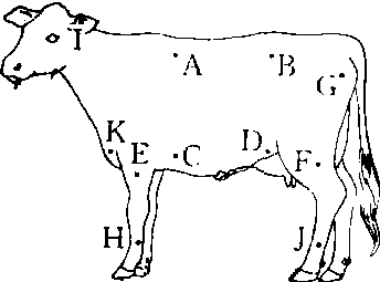 根据畜体不同部位的皮肤温度,按所占全身皮肤面积的%计算出的温度。距离畜体深部越远,体温越低,其皮温亦相应较低。皮肤与外界之间仅隔被毛,受环境影响较大,致使四肢、耳、尾、胸部等皮温差异也较大。常用平均皮温代表之。平均皮温测定是在身体有代表性的部位定若干点,以各点皮肤面积占全身皮肤面积的%(系数)相加求得。如牛的部位系数分别为:躯干上部(A、B4点)为0.25、躯干下部(C、D4点)为0.25、四肢上部(E、F、G6点)为0.32、四肢下部(H、J4点)为0.12,垂皮(K2点)为0.02和耳朵(Ⅰ点)为0.04。 平均皮温可用于计算平均体温。