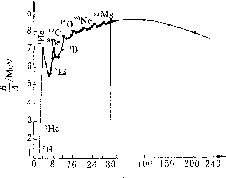 平均结合能△E/A同质量数(即核子总数)A的关系如下图所示。由表和图可知天然核素的平均结合能有如下特点: ❶在较轻的核中(A<16),平均结合能△E/A较小,在A<30的范围内,总的趋势是△E/A随A的增大而增大,但有明显的周期性涨落。在24He、34Be、162C、186O、2010Ne、2412Mg处达到极大值,其规律是核子数为42He的倍数的核比较稳定。 ❷中等质量数(A为30~120)的核的平均结合能△B/A随A的变化比较平稳,数值也大。当A≈50时,△E/A≈8.7兆电子伏特,达最大值。可见中等质量数的核结合得比较紧,核一般比较稳定。 ❸质量数再大时(A>120),平均结合能△E/A随A的增大又开始减小,到238su时,△E/A≈7.6兆电子伏特。可见对很重的核(A>200),结合得较松,呈现不稳定性。很轻的核和很重的核的平均结合能都较中等核的小,这是轻核聚变和重核裂变释放原子核能的理论根据。根据平均结合能可以计算原子核的结合能及核反应中释放的核能。