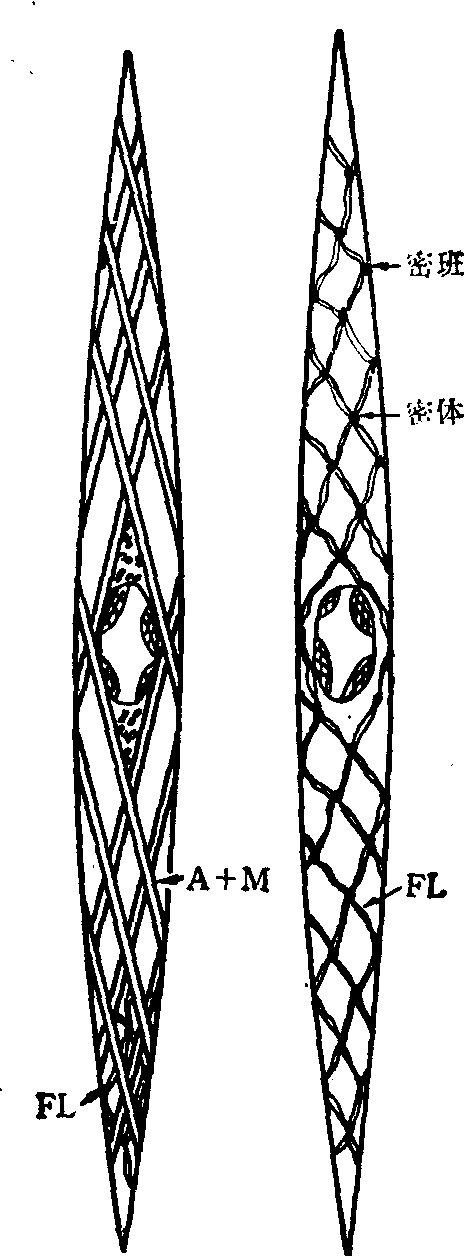 平滑肌细胞的结构(模式图) (左图)肌动蛋白和肌球蛋白纤维(A+M)的排列。每条纤维从肌膜的一侧伸向对侧。 (右图)10nm丝(FL)的网状排列。FL丝从密斑连到密体再到对侧的密斑。 (引自Stephens NL: TheBiochemistry of SmoothMusche. 1977,p.406) 在平滑肌细胞核附近的肌质中含有一些粗面内质网、游离的核蛋白体及少量高尔基体。在妊娠子宫的平滑肌细胞中这些细胞器增多。此外,尚含有一对中心体,少量糖原颗粒,并偶见脂肪滴。平滑肌线粒体的分布在不同器官及同一器官的不同细胞中变化很大。一般来说,部分存在于核附近,其余在周缘与表面小泡紧密接触,它亦能聚集二价阳离子,参与调节肌质中Ca2+的浓度。线粒体与小泡接触的部位可能就是线粒体与细胞外间隙交换Ca2+的处所。线粒体的大小及数量随年龄及肌肉生理状态而变化,妊娠时子宫平滑肌线粒体的数量巨额增多;而老年动物平滑肌线粒体的密度显著下降。 在肌质中占据主要位置的是肌原纤维,但在光镜下生活状态的平滑肌肌质是十分均一的,看不到纤维和横纹。然而,用特殊染色或经硝酸或三氯醋酸浸泡后,即可见纵行的细纹。这就是平滑肌的收缩装置——肌原纤维。平滑肌的肌原纤维虽有双折射性质,但没有明暗相间的横带。在电镜下,细丝显而易见,因而早为人们所公认,粗丝经特殊固定后,在某些平滑肌(收缩或松弛状态)显而易见,有些则难以辨认。因而,有人认为平滑肌的肌球蛋白仅在收缩时才聚合为粗丝。不管怎样,肌动蛋白及肌球蛋白均可从所有平滑肌细胞中按常规方法提取出来。目前已有越来越多的人接受了这样的观点,即在平滑肌细胞中同样存在着粗、细两种肌丝,由它们之间的相对滑动引起收缩。然而,在平滑肌中粗、细肌丝的排列不象骨胳肌那样具有规则的几何图形,细丝一般不与细胞纵轴平行,而在细胞内斜行。再者,粗、细丝的比例亦有不同,细丝较多。二者的比例为1:10~1:15。此外,平滑肌的收缩装置还有另一特点,即存在两种密体。一种游离于肌质中,呈椭球形或纺锤形,另一种附着于肌膜,为区别起见,有人将后者称为密斑或附着板。细丝起止于密斑,并在游离的密体处聚集起来。无论游离的密体或附着于肌膜的密体都含有α辅肌动蛋白。可见,密体及密斑实际上相当于骨胳肌的Z线(盘),在收缩活动不同的肌肉中其数量不等,例如,在大鼠主动脉平滑肌中较子宫或膀胱中者为多。再者,平滑肌中还存在一种直径为10nm的丝。它从密斑连到密体,再到对侧的密斑。这种丝在平滑肌细胞中形成网,作为细胞骨架起支撑作用并可传播张力。它走行于肌丝之间,但不与粗细丝相连。它不含肌球蛋白及肌动蛋白; 有人报告,其主要成分为骨架蛋白,分子量55 000; 不过亦有人报告其主要成分是一种分子量为150 000的蛋白质(其组成成分很可能象其他细胞的中间丝一样,因细胞类型而异)。它不参与肌肉收缩活动,但可使细胞器移动,因而具有类似于微管的作用。 平滑肌细胞的核较大,只有一个,位于细胞的最宽处。有2~5个核仁,染色质聚集在核膜附近。 平滑肌的收缩蛋白质 尽管对横纹肌肌原纤维的成分及分子构筑情况大多已了解得颇为清楚。但对平滑肌却知道得相当不足。 (1) 肌球蛋白:平滑肌的肌球蛋白溶解度较高,可用低离子强度的溶液提取。在氨基酸组成及亚单位成分上亦有所不同。例如平滑肌肌球蛋白的轻链只有两种类型(分子量为20 000及16 000),而骨胳肌有三种。不少人主张平滑肌的肌球蛋白与非肌细胞者相似。但最近发现其在免疫学性质上不仅有别于骨胳肌,而且亦不同于成纤维细胞者。平滑肌肌球蛋白对胰蛋白酶水解的抵抗力较强,而其自身的ATP酶活性较骨胳肌者低得多,而且肌动蛋白对该酶的活化作用要弱得多,但Ca2+对它显示活化作用。分离出来的平滑肌肌球蛋白亦可在体外聚合成丝,不过较骨胳肌者短,分子的安排方式亦不同。平滑肌细胞的粗丝亦由肌球蛋白分子的有序排列构成,但长短不一。虽至今尚未看到M线结构。然而用免疫学方法已证明M-蛋白质的存在,并已从鸡素囊获得M-蛋白质纯品。 (2) 肌动蛋白:平滑肌肌动蛋白与骨胳肌者非常相似,仅个别氨基酸残基有些变动。 (3) 原肌球蛋白: 平滑肌原肌球蛋白与肌动球蛋白的比率高于骨胳肌者; 而与肌动蛋白的重量比与骨胳肌者大致相同。其氨基酸组成、电泳行为及免疫学性质均有别于骨胳肌。它虽也具有通过肌动球蛋白活化肌球蛋白ATP酶的作用,但活化机制似与骨胳肌不同,因平滑肌一般缺乏肌钙蛋白。 (4) 肌钙蛋白: 虽然用灵敏的亲和层析技术已从子宫及素囊中分离出相当于骨胳肌肌钙蛋白TN-C及TN-I的肽,但通过SDS凝胶电泳迄今尚未证明平滑肌中有肌钙蛋白存在。而且有间接及直接的实验证据表明平滑肌中结合Ca2+的调节作用是与肌球蛋白轻链相关的。肌球蛋白在调节机制中起着核心作用。或许脊椎动物平滑肌有双重的调节体系; 主要是与肌球蛋白有关的体系,另外还有某些肌钙蛋白参加。 (5) 在平滑肌细丝中还含有一种分子量为130 000的蛋白质,能抑制骨胳肌肌动球蛋白ATP酶活性。 总之,平滑肌收缩体系的蛋白质与横纹肌有同又有异。肌球蛋白区别最大,肌动蛋白差别最小。原肌球蛋白亦有某些不同。平滑肌肌钙蛋白的含量显著低于骨胳肌;并含有一种分子量130 000的蛋白质,它与横纹肌的任何蛋白质均不同。 脊椎动物平滑肌的收缩蛋白