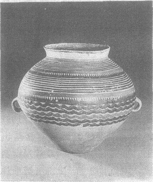 新石器时代马家窑文化半山类型。1975年甘肃省康乐县杨家楞出土。此壶敞口、短颈、溜肩、鼓腹,半环形耳安于腹中部靠下。壶身以红、黑彩绘三层纹饰,每层之间以锯齿纹相隔。第一、二层为平行线纹;第三层为波浪纹。彩绘用慢轮旋画,笔道匀称,色泽搭配协调,整齐之中富于变化,是彩陶器中的优秀之作。半山彩陶见“彩陶罐”条目。