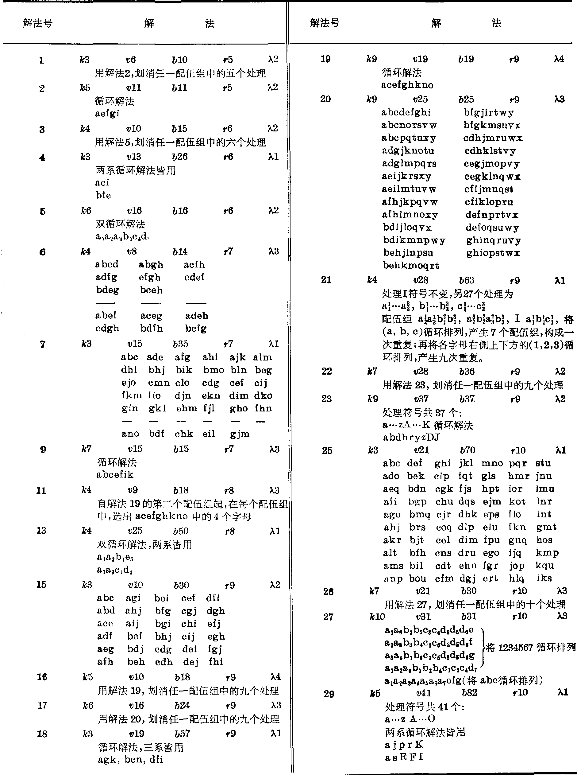 摘自 Fisher RA and Yates F: Statistical Tables for Biological Agricultural and Medical Research,P 84,Oli-ver and Boyd,1957 处理的安排,如解法6、7等; 有的列出了循环解法的字母,如解法2,为aefgi,循环的结果见表4,表中解法1为 表4 循环解法例