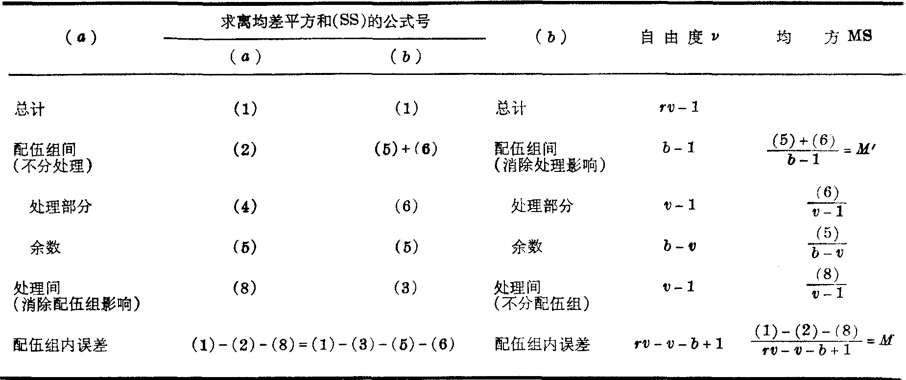 余数 式(2)-式(4)。(5) 配伍组间(消除处理影响)项则由 处理部分 ∑w2i/[rv(v-k) (k-1)] (6)与余数式(5)之和组成,即式(5)+式(6),式(6)中 wi=(v-k)Vi-(v-1)Ti+(k-1)G。(7)处理间(消除配伍组影响) ∑(kDi)2/(k2rE),(8)其中,kDi=kVi-Ti (9)是配伍组内处理的相差,当k>v/2时,用 kDi'=kVi十Ti'。(10) E为有效因子,