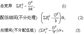 (2)为将配伍组与处理间的相互影响分开,再以式(4)~(11)求下列各离均差平方和。 配伍组间(不分处理)项内的