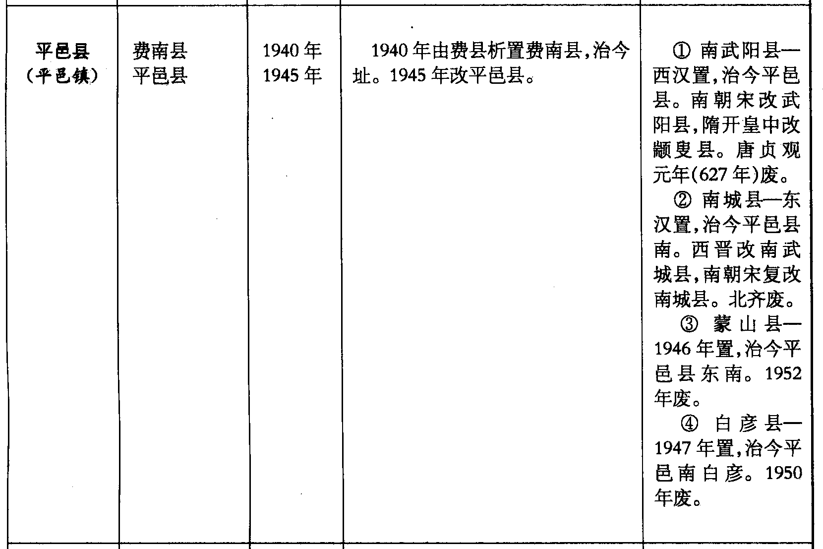 平邑县(平邑镇)费南县平邑县1940年1945年1940年由费县析置费南县,治今址。1945年改平邑县。❶ 南武阳县—西汉置,治今平邑县。南朝宋改武阳县,隋开皇中改颛叟县。唐贞观元年(627年)废。❷ 南城县—东汉置,治今平邑县南。西晋改南武城县,南朝宋复改南城县。北齐废。❸ 蒙山县—1946年置,治今平邑县东南。1952年废。❹ 白彦县—1947年置,治今平邑南白彦。1950年废。
