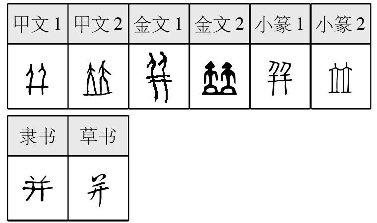 并 ☚ 從 比部 ☛ 并1(併)并2並竝1.bìng 2.bīng1.bìng 上古会意字。甲骨文作“从”字腿上加一横或二横,春秋金文以后加二横。象两人合并义。小篆误从“从”字下两“干”,隶楷沿误,旧字形作“”。 现以“并”为规范字。引申为合在一起的意思。《说文》又有併字,形声兼会意,是“并”的分化字。其实与“并”义仍相同。如:并案办理|合并。并2是一齐、并排着的意思。本来写作並,古体作竝,象两人正面并立之状,见甲骨文金文小篆。用法同并2。如:并驾齐驱|并肩作战|并排坐着。又组词如:并且。也可单用。现在併、並和竝都作异体字处理,见《异体字表》。并是规范字。见《常用字表》《通用字表》等。 2.bīng 古州名。今作山西太原的别称。 并並★异◎常;竝★异◎异;併★异◎常★常◎常
