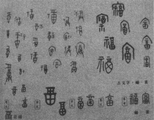 甲骨文时人们对 “畐”、“福” 的各种契形。 从远古时代的洒酒祈福,到如今的“五福临门”,中华民族利用几千年的时空,打造了一个系统的、浓郁的、民族特有的“福文化”。幸福,也与时俱进,与人各异,时代不同,不同处境的人,对幸福的内容和要求也很难一致。有人说,看山是福,观鱼是福;有人说读书是福,休闲是福;有人说行善是福,吃亏是福;有人说健康是福,家和是福等等,都有道理,也都因人而异。什么是 “福” ?清初文人张潮在他《幽梦影》中的感受是: “有功夫读书,谓之福; 有力量济人,谓之福; 有学问著述,谓之福; 无是非到耳,谓之福; 有多闻谅之友,谓之福。” 同时还说: “文名可以当科第,俭德可以当财货,清闲可以当寿考。” 是典型的小知识分子的幸福观。然而,幸福总是现成的,过去的幸福称“回忆”,未来的幸福叫 “期待”。而 “苔痕上阶绿,草色入帘青”,“无丝竹之乱耳,无案牍之劳形”就是本人的眼前之福分。 幸福,源自于不幸与无福。“幸” 是古人主动的随机反应,逢凶而化吉; “福”是古人被动的愚昧祈求,福兮祸所伏,祸兮福所倚。 现代人终于明白了,幸福的到来,不是向神灵的祈求,而是伸开双臂去拥抱天上的掉落。幸福是唾手可得的接取。 其实,幸福不仅与贫富无关,而且 “幸” 与 “福”不是一回事,“福”或许更现实一些,而“幸”则不然。“幸福”,顾名思义,是侥幸得来之福。宁可视作虚妄,也别当作受用。幸福是一股微风,总是在你不经意追逐的情况下悄然而至。在这个物欲横流、诱惑遍地、浮躁不安的世界里,守住自己宁静的心态便是守住了的幸福。 楷 书的 “福”,楷得也不错:人人有地种。楷出了几千年封建社会人们对幸福的一种理念与追求。其实,任何幸福的到来,首先是公众利益的到来与满足,是全民幸福指数的不断提高。国家权力的正确与有效行使,对国民来说才是真正的、最根本的幸福。在当今世界的东方,“小康”就是中华民族共同幸福的代名词。正如北宋诗人黄庭坚《和赵伯充团练》诗句所期待的那样:“醉乡乃是安身处,付与升平作幸民。” 二十一世纪的今天,真乃是苍天有眼,在五十六个苦难的民族头顶上,终于是福星高照了。