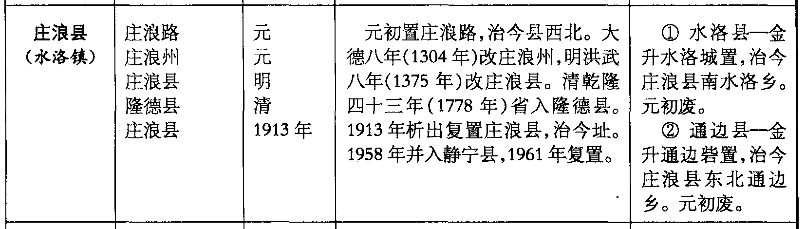庄浪县(水洛镇)庄浪路庄浪州庄浪县隆德县庄浪县元元明清1913年元初置庄浪路,治今县西北。大德八年(1304年)改庄浪州,明洪武八年(1375年)改庄浪县。清乾隆四十三年(1778年)省入隆德县。1913年析出复置庄浪县,治今址。1958年并入静宁县,1961年复置。❶ 水洛县—金升水洛城置,治今庄浪县南水洛乡。元初废。❷ 通边县—金升通边砦置,治今庄浪县东北通边乡。元初废。