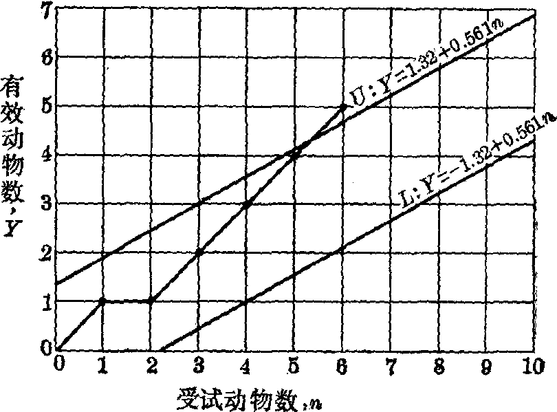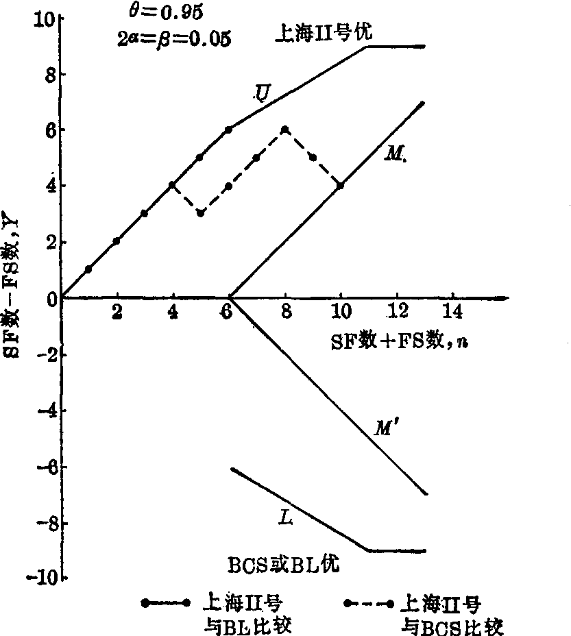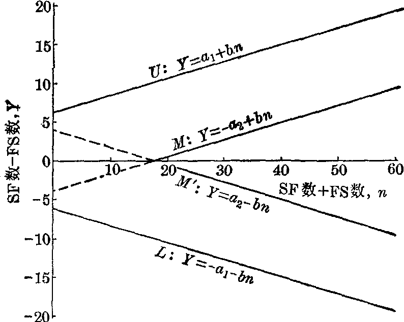 由U及L所组成的序贯试验图与总体率π检验的序贯试验相同,惟横轴n代表SF数+FS数,纵轴Y代表SF数。试验进程如下: 若配对试验结果为SF,则划一格东北方向的斜对角线段;若为FS,则划一格正东方向的水平线段。各线段联结的实验线触及上界U,结论为A优于B,触及下界L,结论为A与B无差别;不触及界限,试验继续进行。