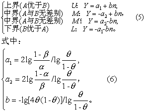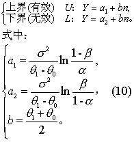 ❹2α及β。根据试验标准规定的θ、2α与β可得出双向序贯试验图四条界限的直线方程为: