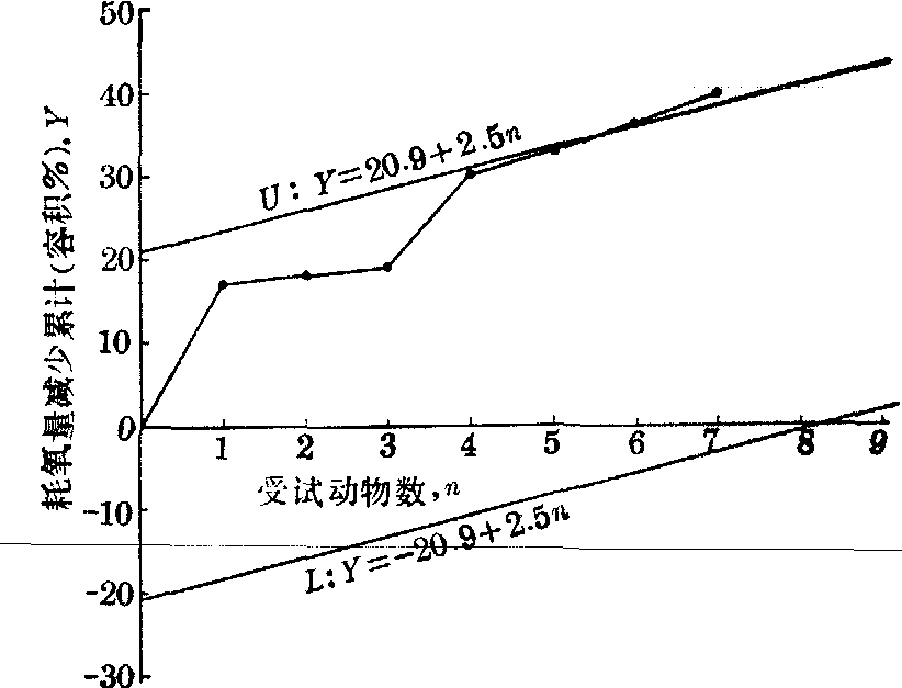 将式(1) 两直线方程在方格坐标纸上作图,横轴n代表试验例数,纵轴Y代表有效例数,如图1。试验进程如下:第1例试验若有效,则从原点(0,0)起,划一格东北方向的斜对角线段;若无效,则从原点(0,0)起,划一格正东方向的水平线段; 第2例试验结果是从第1例所划线段的终点起,以相同规定划一线段。如此序贯进行,各线段可联结成一条实验线。当实验线触及上界U,试验终了,结论为处理有效;当实验线触及下界L,试验也终了,结论为处理无效;当实验线不触及任一界限,表示结论尚不肯定,试验还需继续进行。