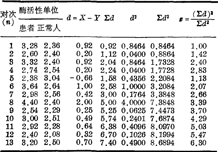 从实验线可知: 试验至第13对即可终止。由于实验线触及上界U,且有∑d=7.40>0,结论为慢性支气管炎病人的胆碱脂酶活性高于正常人。