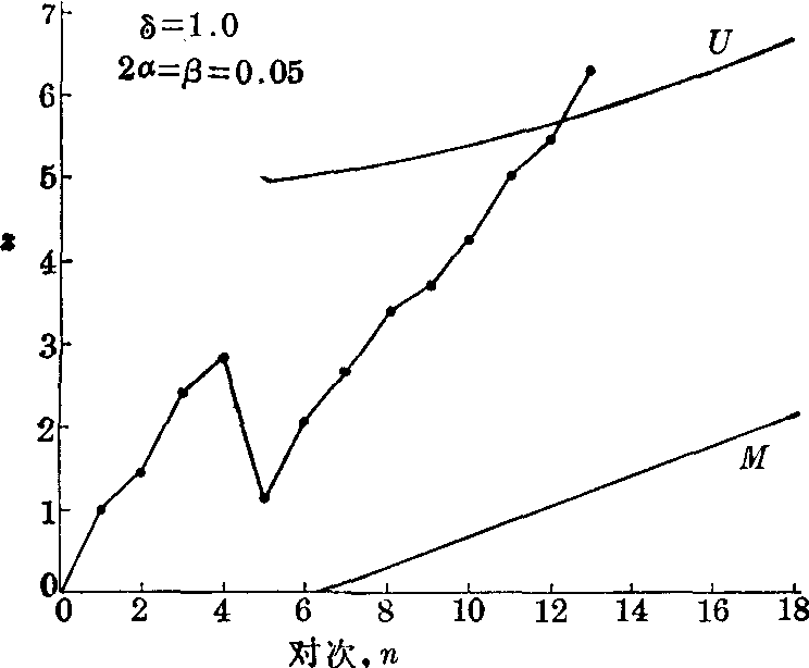 ❹2α及β。根据试验标准所规定的δ1 、2α与β,由表2查得用于开放型双向序贯t检验的边界点坐标,并联结成上、下两界限。上界U略呈弯曲,代表A优于B或B优于A的界限;下界M为近似直线,代表A与B无差别的界限。横轴n代表对子数,纵轴z=(∑d