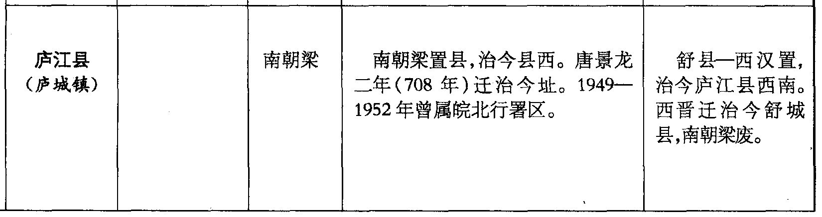 庐江县(庐城镇)南朝梁南朝梁置县,治今县西。唐景龙二年(708年)迁治今址。1949—1952年曾属皖北行署区。舒县—西汉置,治今庐江县西南。西晋迁治今舒城县,南朝梁废。