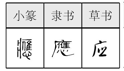 形声,小篆从心, (yīnɡ)声,隶定为“應”。本义读yīnɡ,应当、应该,假借为允许、承诺,由此引申为答应,出声回答,又假借为姓;又读yìnɡ,假借为作出反响,由此引申为接受、顺应、适合、对付、应付、证实等。元代俗字、《手头字》、《简体字表》、《简化字表》简作“应”,据草书楷化。 |