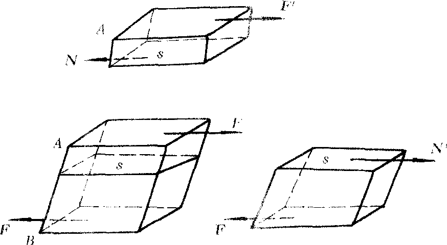 另见:力气 力量 ☚ 力 能量 ☛ 应力 应力yingli物体由于外因(受力、温度变化等)或内在缺陷而发生形变时,在其内部任一截面单位面积的两方所出现相互作用的内力。应力可分为正应力和切应力。如图1所示。 长方体直杆AB两端受到大小相等、方向相反、在同 一直线上的拉力F和F′的作用后产生拉伸形变,直杆处于平衡状态。两拉力是外界物体对直杆作用的外力。设想从直杆任一横截面s处将其截成A、B两段,A段的一端仍受到外力F的作用,另一端则受到B段对它的作用力N。N是由于形变而在物体内相邻两段间产生的相互作用力,即内力。实际上,N是B段左端截面的大量分子对A的右端截面的分子吸引力的合力。因为处于平衡状态,所以F=-N。与横截面垂直的内力(N)同横截面面积(s)的比,称为正应力(σ)。其公式为:σ=N/S或σ=F/S如果物体内部的结构不均匀,例如有缺陷或裂痕,则过这种位置的横截面的内力分布不均匀,由此式计算出的应力,便不能准确地反映物体内部的真实应力分布情况。为了表示某点的应力,在横截面内取面元△s,使该点位于面元内,设作用于面元△s上的内力为△N,则公式 表示该点上的正应力。 当物体发生剪切或扭转形变时,都会产生切应力。如图2,长方体底面有 一向左的拉力F,其顶面有 一向右的拉力F′,这两个力大小相等,方向相反。在这一力偶矩的作用下,长方体发生剪切形变。如果平行于底面的某一截面上所受到的剪切内力为N,那么与截面平行的剪切内力(N)与截面积(s)的比称为切应力(τ)。其表达式为τ=N/S。物体内某点的切应力与正应力一样计算即 。液体内部各点的静压强也是一种应力。如图3所示,在液体内固体表面上各点都受到液体的静压强,即应力。这种应力与固体内正应力 一样,在液体内部任取的假想面上,都有垂直于此面的应力。不论固体表面是什么形状,固体表面上任何地方所受到的液体静压强总是垂直于表面。在国际单位制中,应力的单位为牛顿/米2(N/m2),称为帕斯卡,简称帕Pa)。