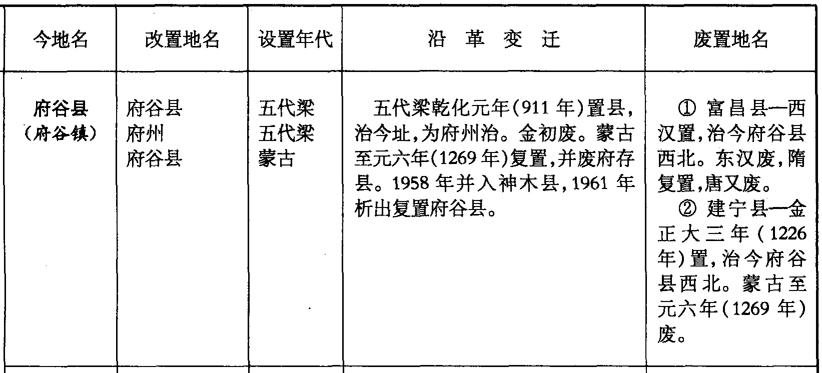 府谷县(府谷镇)府谷县府州府谷县五代梁五代梁蒙古五代梁乾化元年(911年)置县,治今址,为府州治。金初废。蒙古至元六年(1269年)复置,并废府存县。1958年并入神木县,1961年析出复置府谷县。❶ 富昌县—西汉置,治今府谷县西北。东汉废,隋复置,唐又废。❷ 建宁县—金正大三年 (1226年)置,治今府谷县西北。蒙古至元六年(1269年)废。