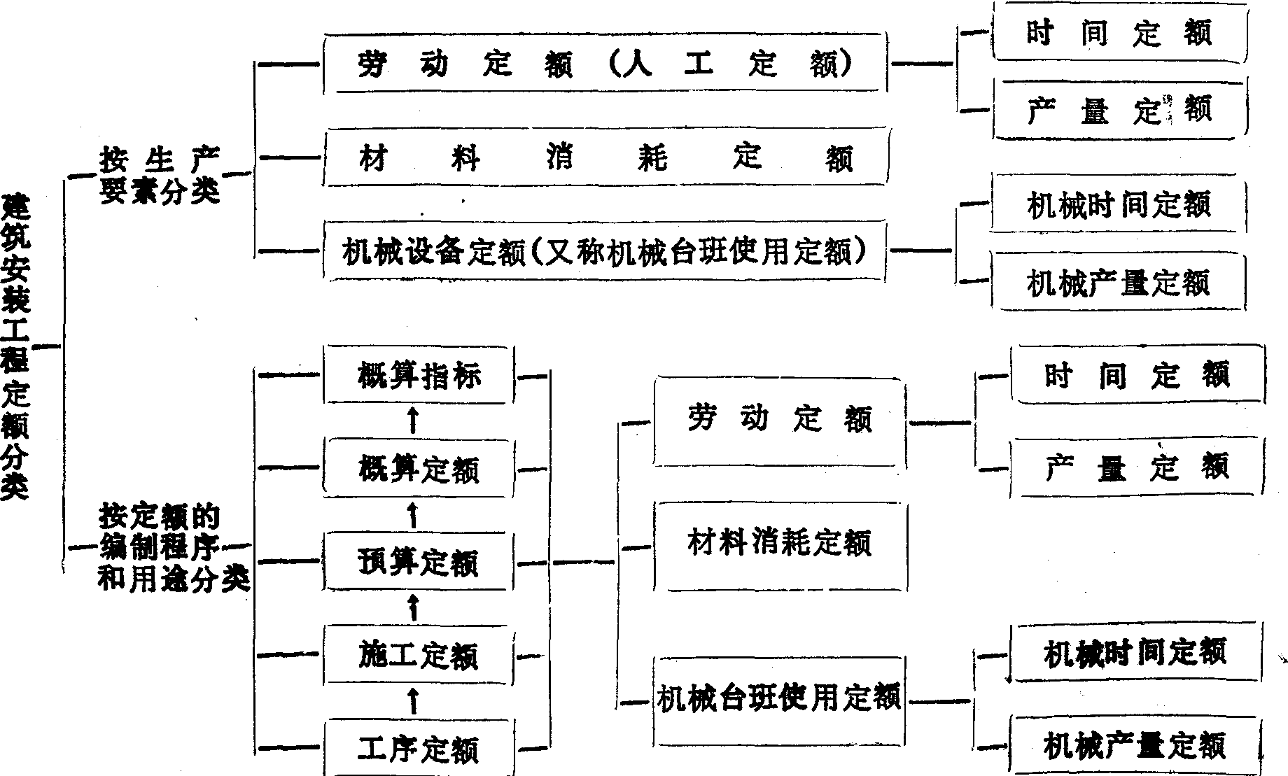二、按生产要素分类: (1)活劳动定额,主要指劳动定额(或称人工定额); (2)劳动对象定额,主要指材料、制品和燃料等方面的定额;(3)劳动手段定额,主要指机械、设备、工具方面的定额。 三、按定制额的编程序和用途分类: (1)工序定额,表示完成每一工序所需要的时间消耗;(2)施工定额,是用以计算施工中资源消耗的定额; (3)预算定额,是施工图设计阶段编制施工图预算使用的定额; (4)概算定额,是初步设计阶段或技术设计阶段编制设计概算用的定额;(5)其他定额,如材料储备定额,工期定额,资金定额,费用定额,流动资金周转次数定额等。具体可见上页图。 |
