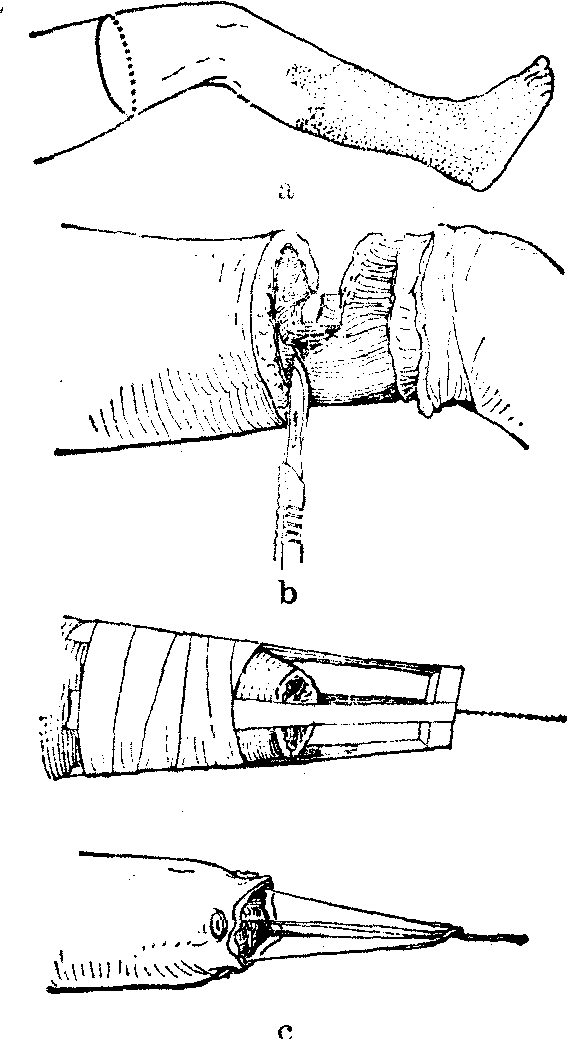 a.切口 b.切断肌肉 c.安装皮肤牵引的两种方法