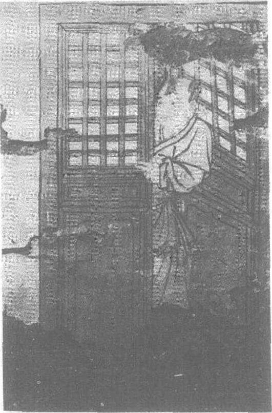 元。山西省长治县郝家庄元墓东壁壁画。图中绘一双扇门,一童子将一扇门半开,大半身探出门外。童子身着交领袍,梳元代男子流行发式“三搭头”。双眸明亮,嘴唇丰润,肌肤细嫩。从其两眼流露的神情看,童子正凝神于张望和探询,专注中含着稚气,十分传神。绘画工整,一丝不苟。作者绘画的线条遒劲灵活,晕染富有层次,用墨得当,显示出元代民间画工的深厚功力。