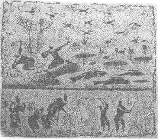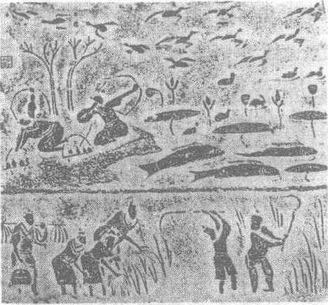| 释义 | 弋射收获画像砖 弋射收获画像砖汉代画像砖。长45.8厘米,高40厘米,厚5.2厘米。画面上部为弋射图,有二人跪于水岸,弯腰张弓,在射空中惊飞的水凫,身后各有一个缴线架,远处有两株枯树,前面水池中有鱼与莲,一片秋天景色。画面下部为收获图,有二人持镰割稻,后面三人捆束和搬运,一人肩担食物给收获农夫送饭。画面上下虽是两种活动,却构成了一个有机整体,具有浓郁的生活气息。现藏重庆博物馆。 ☚ 狩猎画像砖 宴乐歌舞杂技画像砖 ☛ 古代名物 > 雕繪類 > 雕塑部 > 陵墓雕塑 > 弋射收穫畫像磚 弋射收穫畫像磚 yìshèshōuhuòhuà xiàngzhuān 東漢畫像磚。四川成都揚子山二號墓出土。長四五·八厘米,高四十厘米,厚五·二厘米。畫面分上下兩層,上層爲弋射圖,二人跪坐岸邊樹下,彎腰回視,張弓弋射空中驚飛雁騖;水中魚鴨遨游,蓮葉浮於水面,蓮蓬結實飽满,呈現一派田園恬静風光。下層爲收穫圖,二人在前揮鐮刈稻,三人隨後捆束;另有一人肩有所挑、手有所提,似送飯田頭。畫面完整,情調優美,生活氣息濃厚,爲四川畫像磚中之佳作。現藏四川省博物館。公元1972年四川大邑安仁鄉亦出土一塊同樣磚品。 弋射收获画像砖 弋射收获画像砖东汉。长39.6厘米,宽46.6厘米。1972年四川省大邑县安仁乡出土,四川省博物馆藏。浅浮雕。画面分上、下两层。上层为弋射图:在鱼、莲满池,野鸭凫游的河塘边的柳树下,二人正引箭拉弓,准备射向天空中一字列队飞翔的大雁。下层为收获图:稻田深处,二人在前挥镰刈草,三人在后俯身割稻,其后跟随着一挑担提篮的人。此画像以写实的手法,将一派怡淡、幽雅的田园风光和劳动场面呈现在众人面前,使人感受到作品浓郁的生活气息和勃勃生机。