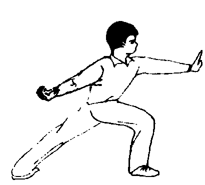为弓步、勾手、推掌同时完成的基本动作。教学重点 强调推掌要与肩平, 勾手的手臂要向后尽量高抬, 肘关节要直。