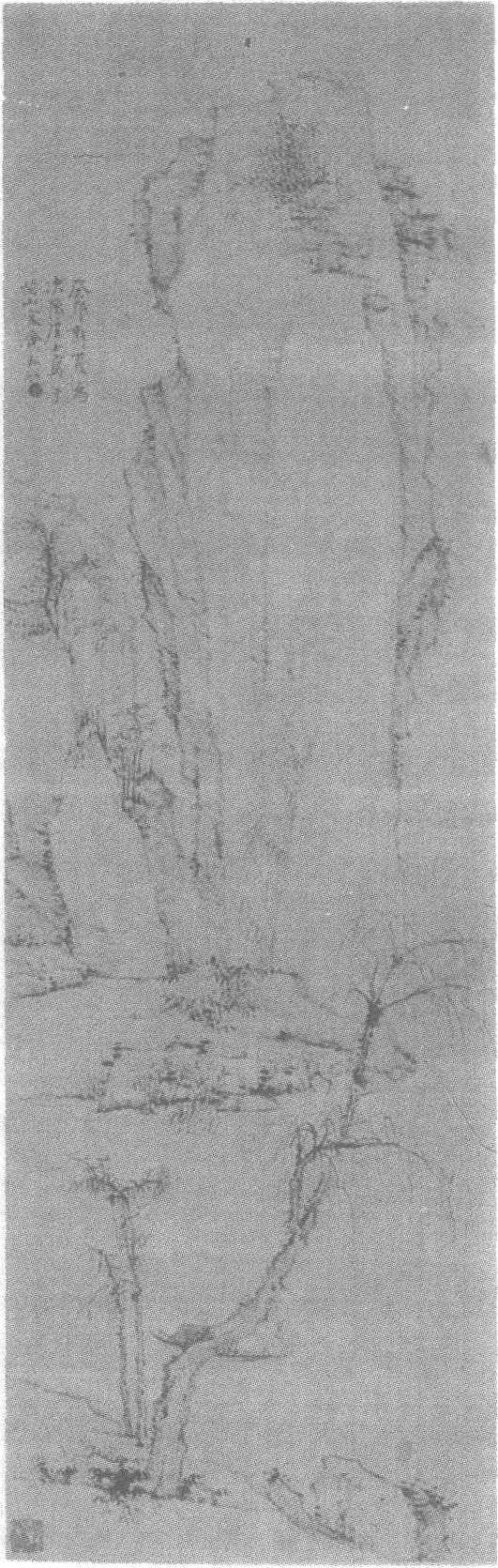 清。弘仁绘。纸本墨笔。纵94厘米,横30厘米。辽宁省沈阳故宫博物院藏。弘仁见《弘仁黄山天都峰图轴》条目。图中远景处山峦突起,主峰巉绝,疏树稀草散布于山间。近处江岸缓坡处几株枯柳在微风中披拂,江面平静无波,整个画面洋溢着浓郁的清秋气氛。在此令人心清气爽的环境中,独舟荡于水面,船头坐一人安静地垂钓,具有淡泊高旷的艺术美。作者以渴笔焦墨作画,仅在适当处少许皴擦以增添山石的质感。笔法元代名画家倪瓒,是弘仁晚年的精品。画面左上自题“癸卯新夏为次豫居士写于芝山客舍”。下钤<弘仁>朱文圆印。图中还有<涓生鉴藏>收藏印一方。