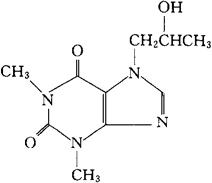 C10H14N4O3=238.25 CAS-603-00-9 7-(2-羟丙基)茶碱。 7-(2-Hydroxypropyl)theophylline. 3,7-二氢-7-(2-羟丙基)-1,3-二甲基-1H-嘌呤-2,6-二酮。 3,7-Dihydro-7-(2-hydroxypropyl)-1,3-dimethyl-1Hpurine-2,6-dione. 支气管扩张药,血管扩张药,平滑肌松弛药。用于支气管哮喘、心绞痛、冠脉不全、心脏水肿等。羟丙茶碱。 Proxyphylline,Prontyl,Thean,Spasmolysin,Oxypropyltheophylline,Purophylline. INN,BAN,USAN,MI.  |