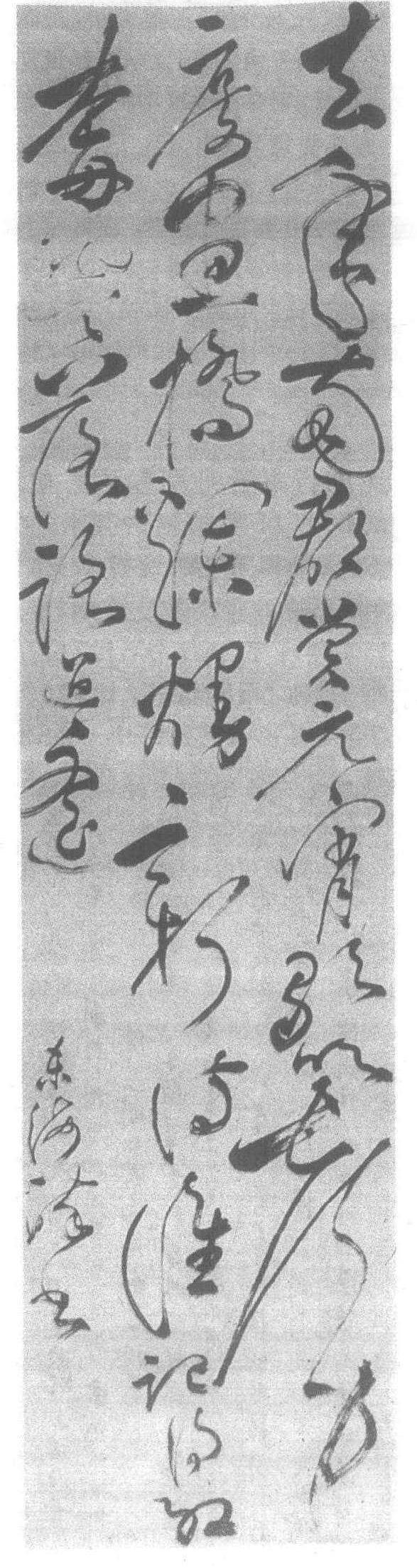 明。纸本。纵122厘米,横30.8厘米。江苏省南京博物院藏。张弼(洪熙元年—成化二十三年,即公元1425—1487年),字汝弼,号东海,华亭(今上海松江)人,成化二年(即公元1466年)进士,历官兵部员主事,兵部员外郎,南安(今江西大余)知府,治绩甚著。善诗文,信笔无稿。工草书,书从怀素、张旭,纵伟跌宕,颇有创意,名动四夷。与李东阳、谢铎友善。明王鏊《震泽集》云:“弼诗多警句,往往为人传诵,其草书尤多自得,酒酣兴发,顷刻数十纸,疾如风雨,矫如龙蛇,奇如堕石,瘦如枯藤,狂书醉墨,流落人间,虽海外之国,皆购其迹,世以为颠张复出也。”刻有《铁汉楼帖》,著有《张东海集》、《鹤城》,《明史》卷二百八十六有传。此草书七言绝句:“去年南郡赏元宵,歌舞声中度画桥,烂熳新诗谁记得,红梅零落路迢遥。东海醉书”计三行28字。是一件能反映张弼草书风格的传世之作。