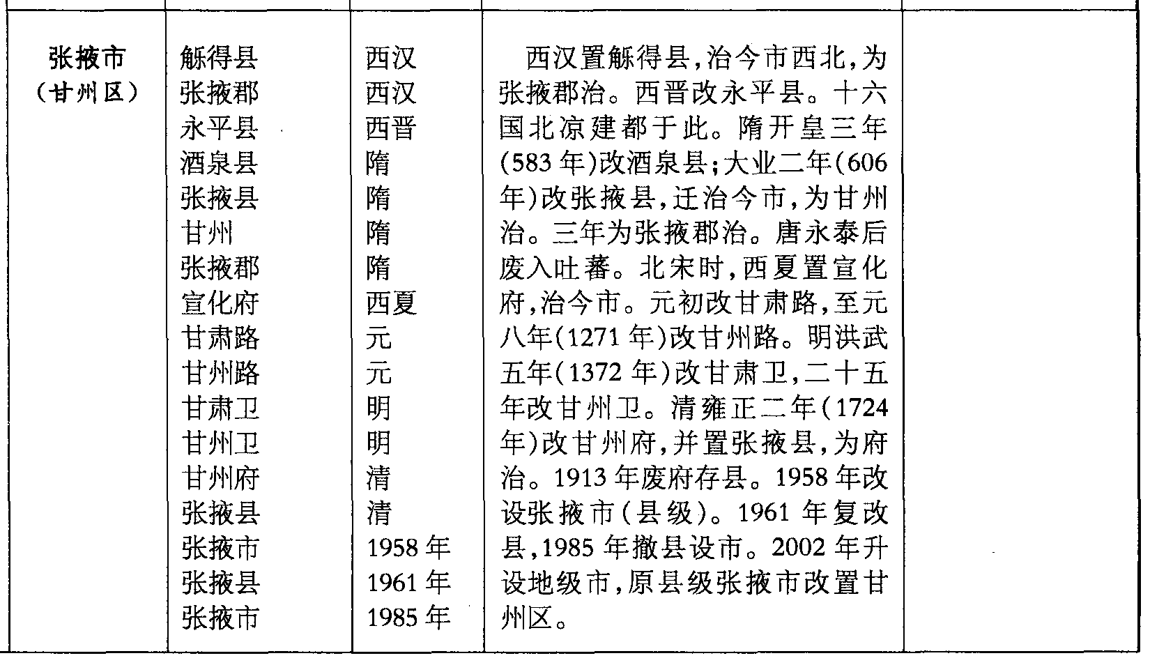 西汉置得县,治今市西北,为张掖郡治。西晋改永平县。十六国北凉建都于此。隋开皇三年(583年)改酒泉县;大业二年(606年)改张掖县,迁治今市,为甘州治。三年为张掖郡治。唐永泰后废入吐蕃。北宋时,西夏置宣化府,治今市。元初改甘肃路,至元八年(1271年)改甘州路。明洪武五年(1372年)改甘肃卫,二十五年改甘州卫。清雍正二年(1724年)改甘州府,并置张掖县,为府治。1913年废府存县。1958年改设张掖市(县级)。1961年复改县,1985年撤县设市。2002年升设地级市,原县级张掖市改置甘州区。