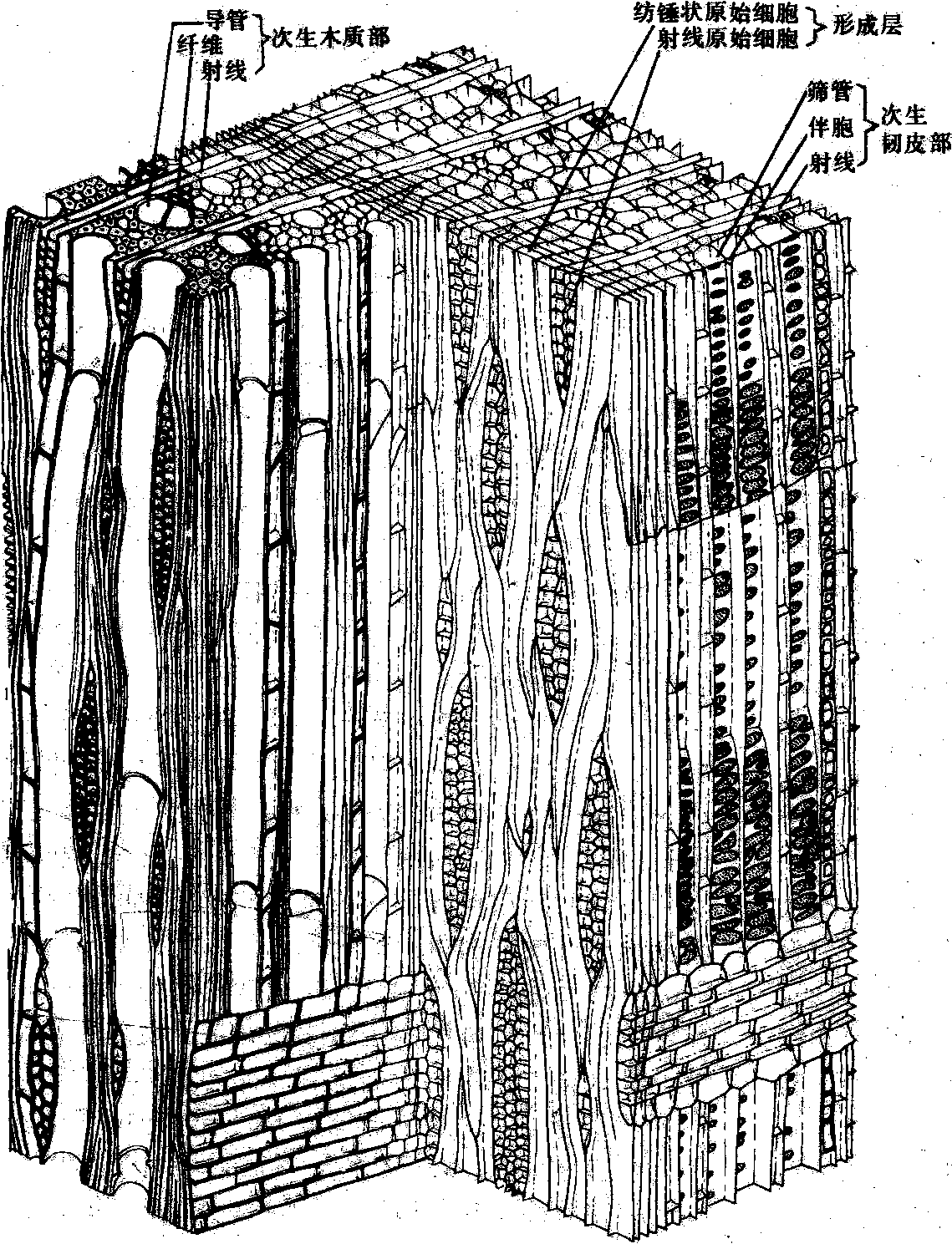 形成层的组成成分及其细胞学特征 形成层为一层有旺盛分裂机能的细胞所组成,形成层与刚分裂衍生出的细胞,彼此形态相似,常组成形成层带。形成层的组成包括纺锤状原始细胞和射线原始细胞。纺锤状原始细胞的切向面呈两端尖斜的纺锤形,径切面为狭长方形。木本双子叶植物的纺锤状原始细胞两端多为双斜面,细胞核较小,细胞长度在150~600μm之间,针叶树的两端为单斜面,细胞核较大,细胞可达4000μm,以至8000μm。它们沿器官长轴平行排列,是形成层的主要组成分子。射线原始细胞的体积较小,近于等径,横贯于纺锤状原始细胞之间。纺锤状原始细胞和射线原始细胞在横切面上皆呈小长方形,整齐地排成一环。 根据纺锤状原始细胞在切向面的排列有迭生形成层和非迭生形成层两种。迭生的纺锤状原始细胞较短,细胞长度相似,排列比较整齐,细胞的末端约处于同一水平面,如柿、洋槐、紫荆、柽柳等植物具有此类形成层,在系统发育上属进化类型。非迭生的纺锤状原始细胞较长,末端相互交替,参差排列,属原始的类型,如杨、柳、杜仲、白蜡树等。 纺锤状原始细胞和射线原始细胞的超微结构大致相同。细胞生理活跃状态时细胞壁薄,细胞中常有1~2个大液泡,富含粗糙内质网和核糖体,高尔基体产生较多的小泡,线粒体分散存在,微管分布于周缘细胞质中; 处于休眠状态的形成层细胞壁厚,液泡小而数多,内质网大多为光滑型,线粒体有时成链状分布,贮存一些油滴和蛋白质体,供植物生长开始时利用。 形成层的分裂活动 形成层主要进行平周分裂。通过纺锤状原始细胞的分裂活动,向外形成次生韧皮部中的轴向系统分子: 筛管或筛胞、伴胞、韧皮纤维,向内形成次生木质部细胞中的轴向系统分子: 导管、管胞、木纤维。射线原始细胞分裂产生维管射线薄壁细胞,组成径向的射线系统。纺锤状原始细胞和射线原始细胞也能进行垂周分裂,使形成层的周径扩大,适应器官的增粗。 植物嫁接时,一般都注意接穗和砧木之间形成层的密接,或促进接合部分先形成愈伤组织,以后在愈伤组织的一定深处产生形成层,使接穗和砧木的形成层相连,这是嫁接成活的关键。形成层的活动与植物体内生长素的含量和分布有关。季节更替、温度变化和光周期 等因素,对形成层的活动也均有影响。春天,木本植物的芽恢复生长,生长物质向下运输,激活形成层;同时在木质部发育过程中,管状分子发生自溶,释放出的生长素进一步促使形成层继续生长。生长季末,茎干伸展完成,形成层活动暂停。 形成层cambiurn产生次生韧皮部和次生木质部的一种侧生分生组织。有人认为形成层分维管形成层和木栓形成层两种,而将形成层作为维管形成层的简称。形成层普遍存在于裸子植物和绝大多数双子叶植物的根、茎中,单子叶植物一般没有形成层。形成层为一层细胞结构,但常与其刚衍生的数层细胞共同组成形成层带。形成层的组成包括纺锤状原始细胞和射线原始细胞。纺锤状原始细胞扁长形,两端尖锐,细胞核相对较小,细胞质内明显液泡化,沿器官长轴平行排列,进行平周分裂,向外、向内分别形成次生韧皮部和次生木质部中的轴向维管系统。射线原始细胞较小,近于等径,横贯于纺锤状原始细胞之间,分裂产生径向的射线系统。形成层也能通过细胞垂周分裂而增加周长。在茎中,存在于维管束内的形成层称为束中形成层,由原形成层保留的细胞转化而来。分布于相邻维管束之间的称为束间形成层,则由初生射线的薄壁细胞恢复分裂而形成。形成层的活动有季节性变化,常受营养状况、水分供应、温度变化、光周期、CO2以及生长激素等因素的影响。