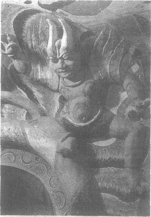 北周。高59厘米。甘肃省敦煌县莫高窟第297窟西龛龛楣北侧塑像。羽人是中国神仙思想的产物,是古代神坛中的飞仙。在魏晋南北朝墓室及敦煌早期的壁画中,常以羽人为题材。莫高窟中高浮雕羽人仅此一件。羽人头生双角,人面,双目外凸,两耳却似兽耳。颈带粗项圈,肩有羽翼,双手如爪。身体粗壮,下着短裤,暴露于外的肌肤以赭红色晕染,使塑像的立体感增强。此雕塑将人的机智和禽兽的勇猛,灵活融汇为一体,形象极为生动,是莫高窟早期作品的代表作。
