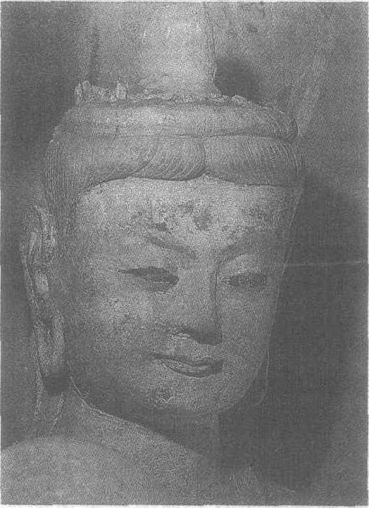 隋。高282厘米。甘肃省敦煌县莫高窟第412窟西龛内北侧塑像。菩萨梳高髻,额前两鬓发丝整洁、细密。阔额丰颐,脸部线条优美柔和。眉弯如柳叶,秀目露情,鼻梁端正高耸,呼吸似隐约可闻。薄唇轻合,嘴角深陷,口目含悦,眉宇和神态中透出聪慧和圣洁,是莫高窟彩塑隋代作品中的优秀代表作。