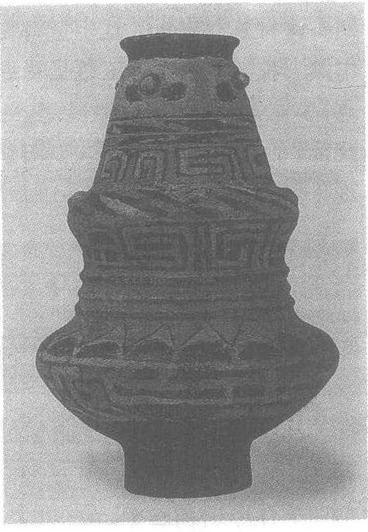 青铜时代夏家店文化。高27.5厘米。内蒙古自治区敖汉旗大甸子早期青铜文化墓出土。辽宁省博物馆藏。陶胎表面黑灰色。器形具有浓厚的地方特色:整个器物似几件器皿的叠伏组合,第一层像一倒置的花盆;二、三层如同扁圆腹的罐;中部束腰,并有三条凸弦纹,象裙子的装饰腰带;底有假圈足。除圈足外,红、黄彩的回纹、三角纹绘满器身,色彩极为醒目。夏家店文化是青铜时代早期的一种文化。因最早发现于内蒙古赤峰夏家店而得名。其年代为公元前2000—前1500年。主要分布于燕山山地,北部至西拉木伦河畔,东达医巫闾山麓,西抵河北张家口地区。遗物中的彩陶器多发现于墓葬内。