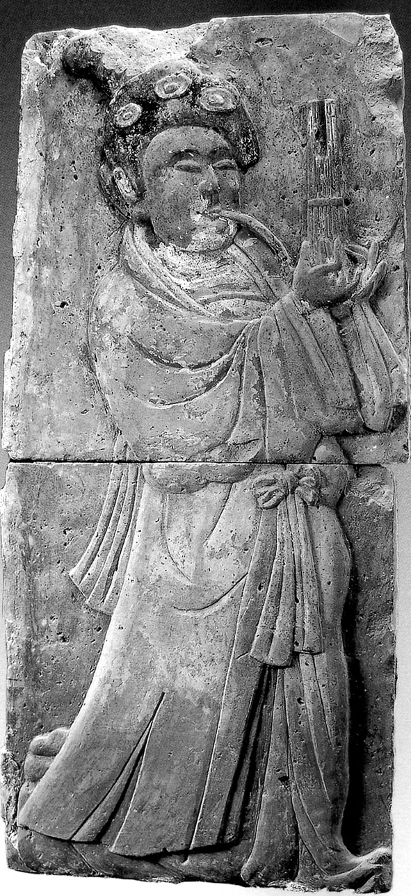 | 释义 | 彩绘女芦笙浮雕砖 彩绘女芦笙浮雕砖cɑihuinü lushenɡ fudiɑozhuɑn1992年彬县底店乡前家嘴村五代冯晖墓出土。由2块砖雕上下拼成1幅完整人物,镶嵌于墓室甬道西壁。人物高0.74米,头饰抱面高髻,戴花三朵,高髻上部残,衣着、姿势与女觱篥浮雕砖第一幅人物相似,区别在于演奏的乐器为芦笙。另外颈上还有项圈三周。演奏者面容宽大,体形壮硕、矮胖,明显区别于其他浮雕形象。现藏彬县文化馆。