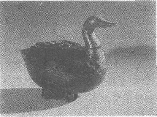 战国早期。长20.1厘米,宽12.5厘米,高16.5厘米。1978年湖北省随州市曾侯乙墓出土。湖北省博物馆藏。木胎。挺颈伏卧鸳鸯形。下有曲蛇状足,颈以上部分与身体榫接在一起,可自由转动、拔出。拔出后榫眼可作出水口。体中空,背开长方孔,上设带纽小盖,可开启注水。颈以上髹红漆,描黑点纹;身体在黑漆地上,以红、黄两色漆绘波折纹、圆点纹、锯齿纹等;腹两侧各有一幅图:左为撞钟图——一对凤鸟口衔编钟架相对而卧,一鸡首怪兽人立着,斜握一长杆正欲击钟。右为敲鼓舞蹈图——一穿插在树杆上的圆鼓两边,各立一个头顶倒三角形饰物、打扮成怪兽的人,一个双手击鼓,一个挥舞长袖跳舞。此盒造型生动、形态逼真,图案独特,集欣赏、实用于一体,颇具匠心。