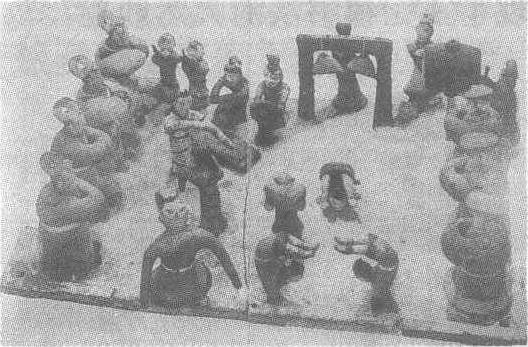 西汉。高22厘米,长67.5厘米,宽47.5厘米。1969年山东省济南市无影山1号西汉墓出土。山东省济南市博物馆藏。在长方形陶底盘上共有12人(出土时缺一人),后侧是乐队,有的吹笙,有的抚瑟,引人注目的地方还有敲钟者和击鼓者。陶底盘的中部有四位柔术表演者,有的倒立,有的折腰。其旁一男俑和一女俑展臂扭腰,翩翩起舞。两侧分立着七位观众,皆拱手而立。奏乐者严肃认真;舞蹈者、演杂技者面带笑容;观赏者其乐融融。整个场面热烈、欢快。陶塑风格质朴简练。色彩醒目但不失柔和,为研究我国古代杂技表演艺术提供了珍贵的资料。