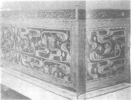 西汉。长256厘米,宽118厘米,通高114厘米。1972年湖南省长沙市马王堆1号汉墓出土。湖南省博物馆藏。此棺是马王堆1号汉墓四层套棺的第二层。木胎,长方形。内髹朱漆,外在黑漆地上,遍饰色彩斑斓。凸起的云气纹、其作法是用沥粉勾边线,再于线内填朱、白、黄、绿、赭等色漆。云气纹间用堆漆饰以神兽、仙人、鸟、鹤、豹、牛、羊、鹿、马、兔、蛇、鱼等十几种禽兽,组成怪神吞蛇、仙人降豹、仙鹤啄食、怪兽人立、赤豹伏地、巨鸟衔鱼、怪神弹奏、仙人鞠躬、多尾异兽、怪神骑马、豹雀对立等50多种图案。这些神兽怪禽变化多端,形态各异,与云气浑然一体,富有浓厚的浪漫主义色彩,表现了作者丰富的想象力和熟练的技法,是研究当时绘画艺术的重要材料。
