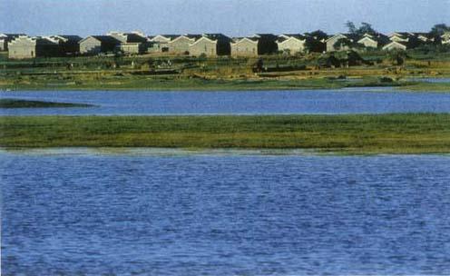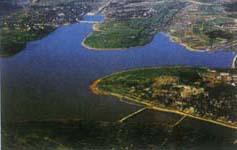 王婆牧马 位于景区中段南侧石屏上,当水位下降五米时,便呈现出一幅王婆牧马的天然画卷:一群骠悍的骏马,神态各异,有的跳跃奔驰,有的悠闲静卧,而王婆则端坐石凳上安详地微笑著。
