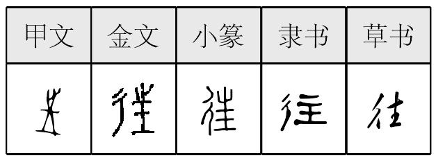 ❹ 跋来报往|长此以往|古来今往|寒来暑往|溘焉长往|令人神往|明来暗往|南来北往|你来我往|人来人往|日来月往|神醉心往|倏来忽往|暑来寒往|泰来否往|心驰神往|一如既往|迎来送往|悠然神往|知以藏往 往往,甲骨文作  ,金文作 (摹本),《説文》古文作 ,小篆作 。 甲骨文从止, 王聲。“往” 的初文。 金文从彳, (huáng)聲。《説文》古文意符爲 “辵”,从辵與从彳表意相同。“”隸定或作 “𡉚”,作爲聲符在隸楷時代多寫作 “王”,如 “匡” “汪” “狂”等字所从, “王” “” 音近, 尚可主聲, 而今體 “往” 的原聲符字則訛變爲 “主”,難爲聲符矣。“往” 的本義是到某處去,引申爲過去等義。卜辭或用本義。銘文或讀如 “皇”。提示: 今滬方言“王” “皇” 不分,正表現爲古音孑遺,故方言亦是古音古義的化石,方言研究必有助於古文字研究。 楚簡帛文作 ,沿襲古體。秦簡牘文作 ,形近今體而古意猶存。 往徃wǎng(8画)