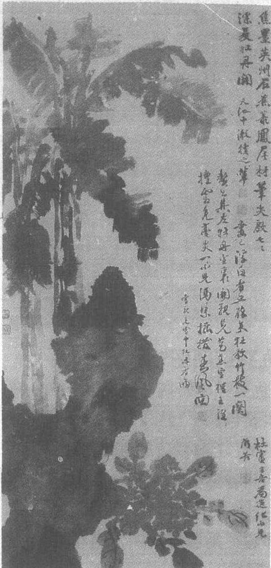 明。徐渭(见《徐渭墨葡萄图轴》条目)绘。纸本墨笔。纵120.6厘米,横58.4厘米。上海博物馆藏。此图画牡丹蕉石。湖石矗立,湖石后面挺出二株芭蕉,蕉叶宽阔,相互错落。湖石旁横出一株牡丹,绽花吐蕊。笔墨饱满,意趣横生,淋漓畅快,在风格上,有沈周质朴浑厚的笔调和陈淳豪爽疏秀的风致,更有他自己的风格。全图除了牡丹的叶脉之外,全用水墨泼写而成,笔致恣肆,奔放豪爽,在一片浑融的墨色中,笔锋变化多端,泼墨、焦墨、破墨并用,呈现出疏密、浓淡、轻重、干湿的多种变化,湖石、芭蕉、牡丹各具神态。此图是徐渭水墨大写意花卉的得意之作。右旁三处题语,浓墨行草,诗、书、画互相映衬,相得益彰。