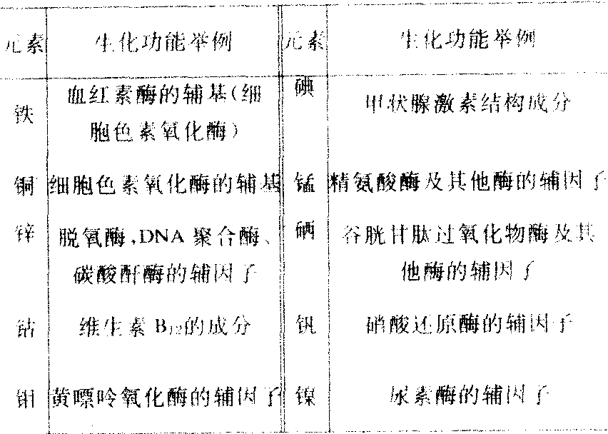 未知确切生化作用的微量元素 ![]() ☚ 生物元素 有机化合物 ☛ 微量元素trace elements系指在人体内含量微小的元素而言。人体与其他生物体一样,是由各种元素构成的,其中有些元素占的比重大,如碳、氢、氧、氮、磷、钾等,系组成蛋白质、糖、脂肪及骨骼等的重要成分,为人体不可缺少的元素。但亦有很多种元素为人体所必需,虽然含量甚微,但不可缺少,如铁参与血红蛋白生成、铜参与造血、碘参与生成甲状腺素、锌参与细胞生长与新陈代谢、氟参与骨形成与代谢,以及钴、锰、硒、钼等多种参与酶的生成与代谢,对机体生长发育、新陈代谢有重要意义。 微量元素植物生活所必需但需要量极微,稍多会发生毒害的一些元素。如铁、铜、锰、硼、锌、钼、氯等,缺少这些元素,植物生长不良。农业上常以微量元素作种子处理、根外追肥,用来提高作物产量。 微量元素亦称“痕量元素”。维持人体正常机能所必需的、需要量仅为每公斤体重万分之一毫克或微克的一些元素。已公认的有14种元素,如铁、铜、锰、锌、硼等。 微量元素microelement指含量占体重0.01%以下的元素。目前已知对人体具有生理功用者有14种,即铁、锌、铜、锰、碘、氟、钴、铬、镊、钼、硒、硅、锡、钒,称必需微量元素。其特点是在人体需要量范围内为人体所必需,量大时则对人体有害。有些非必需的微量元素有时也在人体中发现,如铝、锑、镉、汞、锗、铷、银、铅、金、铋、钛、锆等,是由外环境污染而来。 微量元素 微量元素在生物组织中有些元素存在数量极少,甚至仅有痕量,称之为微量元素或痕量元素。目前已确定十四种微量元素为动物或人体生理所必需;即铁、碘、铜、锌、锰、钴、钼、硒、铬、镍、锡、硅、氟和钒。其中铁和碘在营养上有明确的实际意义,前者已有独立条目,现将碘和其他生理必需微量元素,择要介绍如下: 含碘较高的海产食物