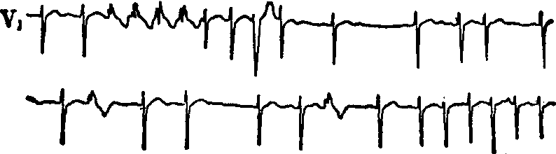 室内差异传导的蝉联现象 频繁的房性早搏伴室内差异传导,部分未下传。早搏形成两次短阵性房性心动过速。开始的房性心动过速中前四个QRS波群呈右束支阻滞图形蝉联现象,第二阵房性心动过速频率与第一阵房性心动过速相同,仅前一周期短0.01s,所以没有发生室内差异传导。 所谓非相性心室内差异传导是指交接处逸搏的QRS波群形态与下传的不同而言,也有认为是: ❶冲动起源于交接处,而希司束有纵向分离,使心室除极不同步; ❷冲动起源于分支; ❸结下发生4相传导阻滞等所造成。 ☚ 心室内传导阻滞 预激综合征 ☛ 心室内差异传导 心室内差异传导intraventricular aberrant conduction即由于生理性传导变异,造成心室除极顺序发生变化,QRS波群异于正常的现象。该现象由Lewis于1912年首先报道。心室内差异传导,往往与心率有关,故Schamroth于1963年又将其分为时相性和非时相性两种。发生机制是异位激动发生过早,在向前传导中,部分传导系统尚处于生理性不应期,故只能以较慢的速度或从脱离不应期的其他部分到心室,因而心室除极和复极顺序与平时不同,遂产生室内差异性传导。异位激动产生愈早,发生室内差异传导的可能性也愈大,心动过速的频率也愈快,也就越容易出现心室内差异传导。其心电图主要特点是: ☚ 室性心律的传出阻滞 慢频率依赖性差传 ☛ |