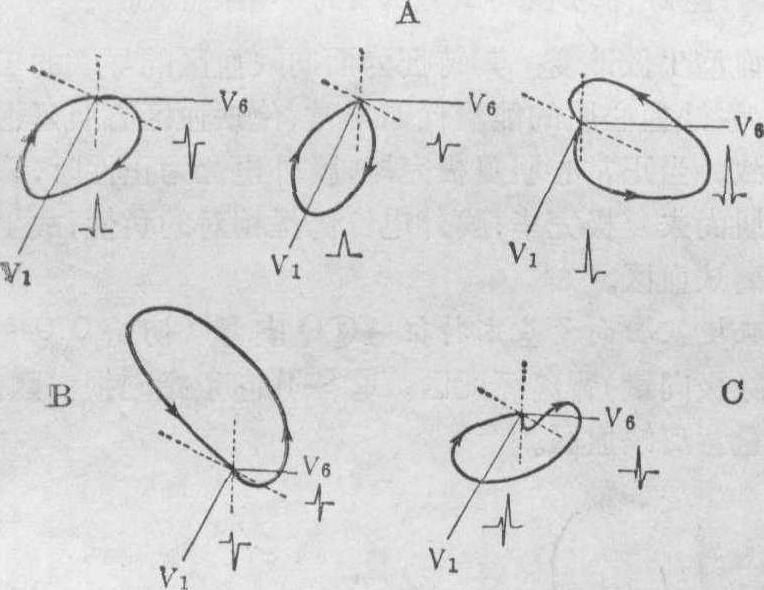 心向量图: 左心室肥大时除极顺序不发生明显变化,仅有“量”的改变,表现为向左后方的除极面及综合向量增大。由于左心室壁的增厚及左束支或分支被牵拉受损,使除极时间延长。复极顺序与正常相反,引起继发性ST-T向量变化,如同时伴有心肌缺血,使心室复极差力变化,则可引起原发性ST-T向量变化。心向量图特征是空间QRS环体积增大、初始向量在左或右前上方,最大向量向左后上或下,振幅明显增加,超过正常最高值,终末向量多由左后下方返回。QRS环总时间轻度延长。S-T向量随T环的移位而逐渐移向右前上方。轻度肥大时,T环的方位,运行方向均与QRS环一致。明显肥大时,T环变小,逐渐移到右前上方。上横面QRS环,S-T向量,T环变化,由于病因不同而有所差异。当左心室收缩期压力负荷过重时,QRS环呈逆钟向运行,最大向量及QRS-T夹角增大,但初始向量减小,向左后方向量增加,S-T向量及T环方位与QRS环相反。当左心室舒张期容量负荷过重时,QRS环多为“8”字形,少数顺钟向运行,最大向量明显增加。但S-T向量及T环方位则多与QRS环一致。 右心室肥大 右心室壁厚度仅有左心室壁的1/3,故轻度右心室肥大时,左心室壁的除极电势仍然占优势,综合心电向量的改变就不明显,只有当右心室壁的厚度达到相当程度时,才会较显著地影响除极的心电综合向量向右前方增大,从而使心电图与心向量图产生特征性的改变,以上横面及胸导联最明显。 心电图表现可归纳为三种基本类型: ❶当心向量图上横面QRS环呈顺钟向运行,初始向量偏向左前方,主体及终末向量偏向右前方,而T环和S-T向量指向左后方时,心电图上右胸导联(V1、2)的QRS波群呈qR、R型,T波倒置,左胸导联(V5、6)则呈rS型;少数情况下,QRS环呈逆钟向运行,初始向量向右前、主体向量显著向左前、终末向量指向右后方,这时V1、2呈Rs型,V5、6呈qRS型(图2A,图3)。此型多见于右心室收缩期负荷过重,如肺动脉瓣狭窄、肺动脉高压及严重二尖瓣狭窄等引起的显著右心室肥大。 ❷当上横面QRS环呈逆钟向运行,初始向量的方向和幅度正常,主体部移向右后方,这时V1~V6QRS波群均呈rS型,额面QRS环移向右上方,所以标准导联出现S1 S2 S3型(图2B)。此种类型常见于慢性肺原性心脏病或某些先天性心脏病所致的中度右心室肥厚时(参见“束支、分支传导阻滞”条)。 ❸当上横面QRS环初始向量近乎正常,作逆钟向运行,而代表左心室电势的向量随即稍转向后方,然后朝前朝右顺钟向扭转,整个主体部居于横轴(X轴)之前,并且终末向量在离心肢的右前方时,V1、2的QRS波群呈rSR′或RsR′型,V5、6为qRS型(图2C),多见于右心室舒张期负荷过重时,如房间隔缺损等。上述三种类型可随肥大程度而变动。