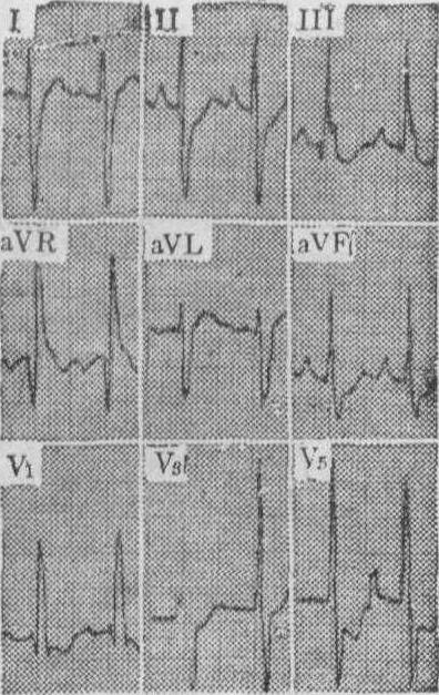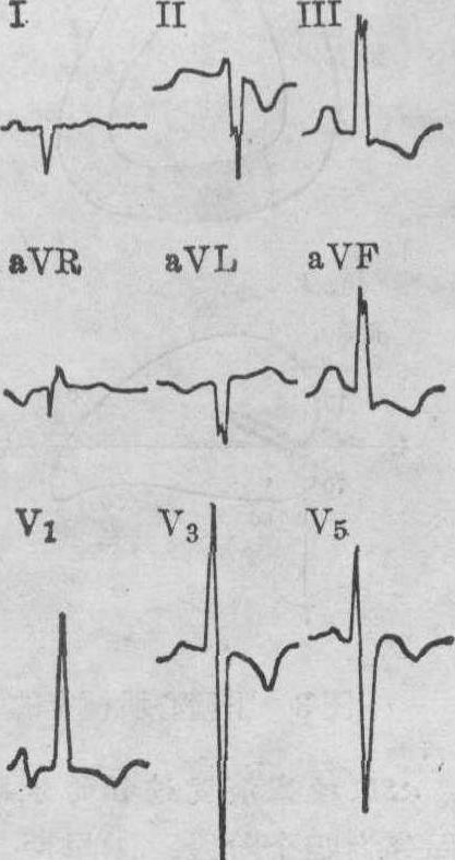 图3 右心室肥大心电图 右心室肥大的心电图表现除上述QRS波群形态的改变外还有: ❶Rv1>1.0mV或R′>1.5mV,Rv1+Sv5>1.2mV,Sv5>0.7mV,V1R/S>1及V5 R/S<1; ❷RaVR>0.5mV,R/Q>1; ❸额面QRS电轴显著右偏≥+110°; ❹VATV1>0.03s; ❺QRS时限<0.12s; ❻V1的ST段压低超过0.05mV及T波倒置,以及 ❼右心房肥大。上述指标中一般以V1R/S>1及V5R/S<1;V1或V3R呈qR、R、Rs或V1~V5呈rS型、RV1>1.0mV;电轴≥+110°及V1的ST-T改变等的诊断意义较大。其他如aVR的R/Q>1; RaVR>0.5mV;VATV1及QRS时限轻度延长及右心房肥大等;可做为辅助诊断条件。一般来说,阳性指标愈多,超过正常值范围愈大,则诊断的可靠性越高。虽然心电图对诊断明显的右心室肥大准确性较高,但早期发现,还有一定困难。另外,尚需注意与A型预激综合征、右束支传导阻滞、左中隔分支传导阻滞、后壁心肌梗塞及肺气肿等鉴别。 双侧心室肥大 双侧心室肥大的心电图表现: ❶大致正常心电图,这是由于左右两侧心室除极向量电压同时增高,互相抵消所致; ❷单侧心室肥大心电图,只表现出占优势的一侧心室肥大,而另一侧心室肥大的图形被掩盖; ❸双侧心室肥大心电图,少数病人可同时显示明确的左、右心室肥大的心电图特征,或具有明确的一侧心室肥大的心电图特征,同时又存在对侧心室肥大的某些征象。