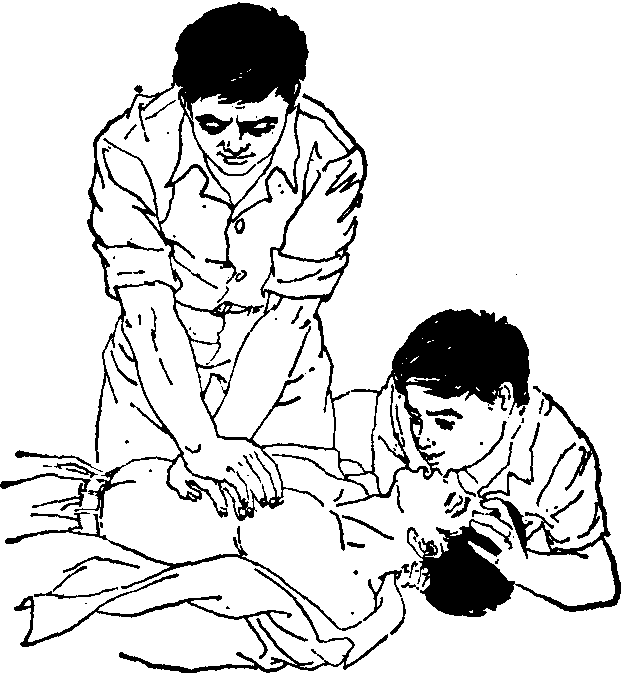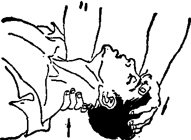 (3) 口对口人工呼吸: 施行心脏按压以维持血液循环的同时,进行人工呼吸,以保证氧的输入和二氧化碳的排出。病人仰卧,术者一手托起病人颈部,使其头部尽量后仰,以保持呼吸道通畅(图2)。有时尚需将下颌向前拉,同时用拇指翻开病人口唇,便于吹气。另一手捏住病人鼻孔,深吸气后对准病人的口用力吹出,然后放松鼻孔。如此反复,每分钟12次(吹气2s,病人呼出3s)。口腔内有异物时,应先排除。一般每按压心脏4~5次作口对口人工呼吸一次 (只一个人兼做时,可15比2)。开始时吹气宜多而快,10~20次后,用力渐减小,以维持上胸部轻度升起即可(图3)。