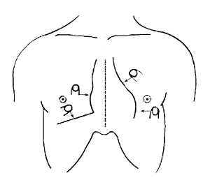 一般嘱患者取仰卧位,检查者用指指叩诊法(见下图):左手中指紧贴胸壁与心脏外缘平行,也可紧贴肋间隙与肋间平行,从肺脏向心脏方向叩诊。叩诊心脏右界时,自肝浊音界的上1个肋间开始,依次按肋间上移至第2肋间为止;叩诊心脏左界时,则自心尖搏动的肋间开始,从心尖搏动外2~3cm处由外向内进行叩诊,并依次上移至第2肋间为止。当沿肋间隙由外向内叩诊时,叩诊音由清音变为比较浊的叩诊音时,此浊音的界线即为心脏相对浊音界;越过相对浊音界继续向内叩诊或行普累施法叩诊,叩诊音变为实音时,此界为心脏绝对浊音界;从第2肋间向上叩出一轻度浊音区,即为心上浊音区。正常成人心脏左右相对浊音界距前正中线的距离见“正常心界”。