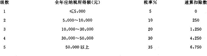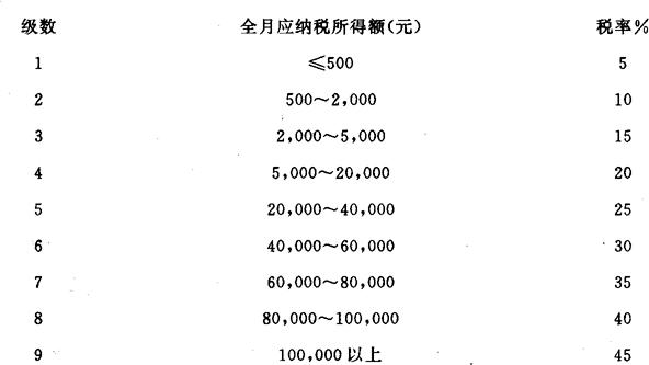 例1,某公司本月支付其高级职员张某工资1,500元,各种津贴300元,奖金500元,请计算应扣缴张某个人所得税税额。 张某全月收入1,500+300+500=2,300(元)张某全月应纳税所得额2,300-800=1500(元)张某本月应纳税所得税=500×5%+1,00×10%=125(元)由于个人所得税对工资、薪金所得采用超额累进税率计征,所以,我们也可以对表-加以如下改变,供纳税人将所得额减除费用扣除额后直接使用。 工资、薪金所得适用税率表