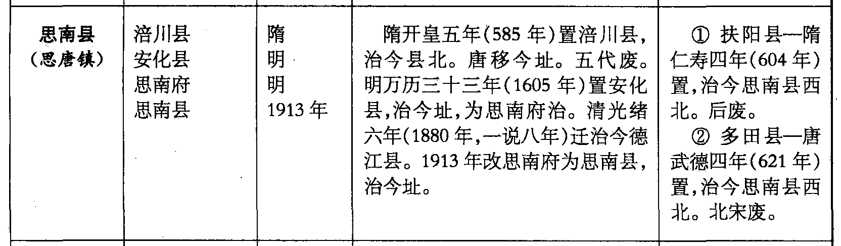 思南县(思唐镇)涪川县安化县思南府思南县隋明明1913年隋开皇五年(585年)置涪川县,治今县北。唐移今址。五代废。明万历三十三年(1605年)置安化县,治今址,为思南府治。清光绪六年(1880年,一说八年)迁治今德江县。1913年改思南府为思南县,治今址。❶ 扶阳县—隋仁寿四年(604年)置,治今思南县西北。后废。❷ 多田县—唐武德四年(621年)置,治今思南县西北。北宋废。