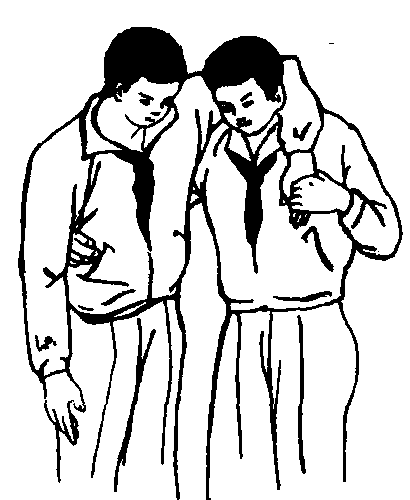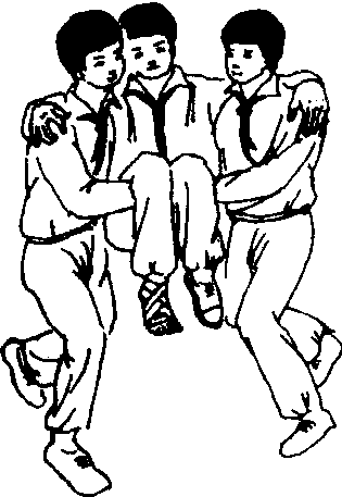 ❷抱持法。把伤员的一臂挂在自己的肩上,然后用一手托住其背部,另一手托住大腿将伤员抱起(图2)。这种方法适用于伤势较轻、神志清醒的伤员。 ❸托椅式搬运法。两名急救者相对而立,各以一手握住对方的前臂,另一手互搭在对方的肩上。伤员坐在急救者互握的手上,两手分别搭于他们的肩上(图3)。此法适用于足部损伤而行走困难的伤员。 ❹卧式三人搬运法。三名救护者同站于伤员的一侧。 ![]()